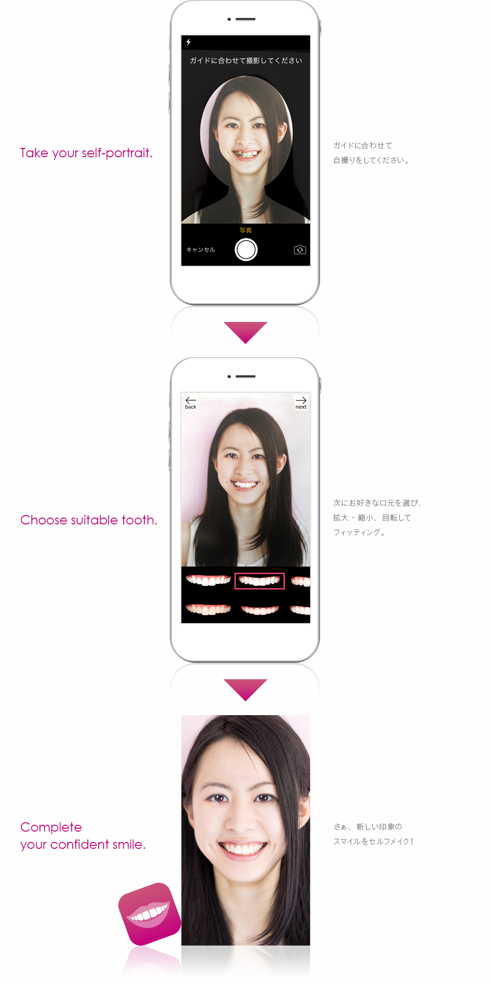 アプリケーションは2017年6月配信予定です。 いろいろな歯並びを試して自分にぴったりの笑顔を作ってください。口元の印象で変わる新しい自分を体験してください!